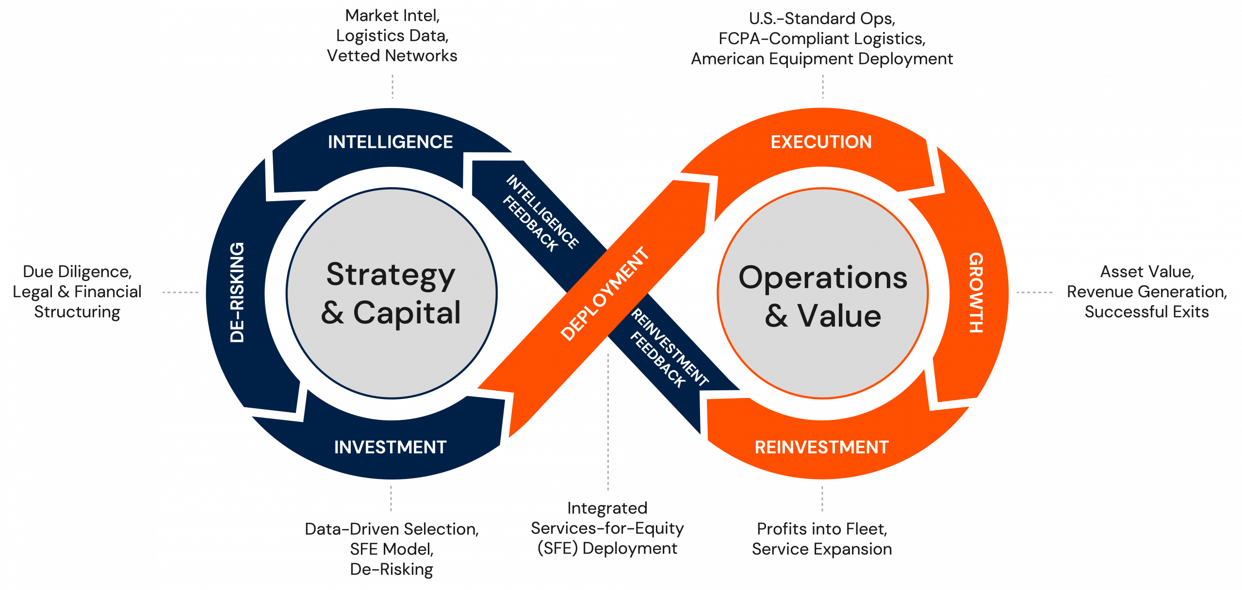 Turning Logistics into Leverage. Unlike traditional firms that separate capital from operations, The IDC Group integrates them. By feeding our logistical data directly into our investment strategy, we create a self-reinforcing cycle that de-risks exploration and accelerates project timelines.